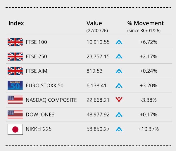 Also in the UK, the mid-cap focused FTSE 250 ended February 2.17% higher on 23,757.13 and the FTSE AIM recorded a small 0.24% gain to close the month on 819.53. The Euro Stoxx 50 closed the month over 3% higher on 6,138.41. In Japan, the Nikkei 225 closed out February on 58,850.27, gaining over 10% in the month, supported by renewed optimism surrounding the Japanese economy and corporate sector.