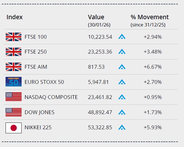 Data published at month end showed economic growth at the end of 2025 in the eurozone had surpassed expectations and unemployment fell. The Euro Stoxx 50 closed January 2.7% higher on 5,947.81. In Japan, the Nikkei 225 ended January on 53,322.85, gaining over 5.9% in the month.