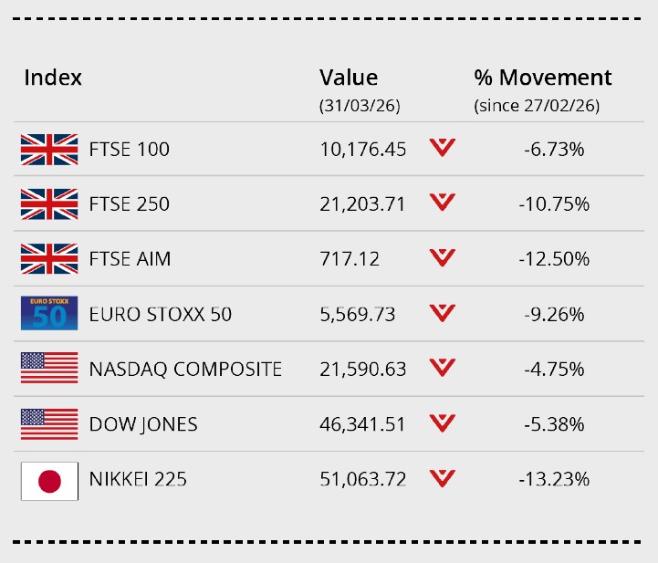 In the UK, the FTSE 100 closed the month over 6% lower on 10,176.45 and the mid-cap focused FTSE 250 ended March over 10% down on 21,203.71. The FTSE AIM recorded a loss of over 12% in March to close the month on 717.12. The Euro Stoxx 50 closed the month over 9% lower on 5,569.73. In Japan, the Nikkei 225 closed March on 51,063.72, falling over 13% in the monthIn the US, the Dow Jones closed the month down over 5% on 46,341.51. The NASDAQ registered a monthly loss of 4.75% to close on 21,590.63.